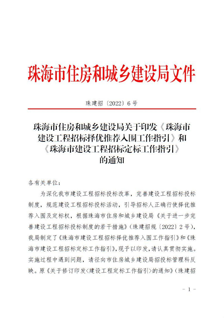 • 珠海市住房和城鄉(xiāng)建設(shè)局關(guān)于印發(fā)《珠海市建設(shè)工程招標(biāo)擇優(yōu)推薦入圍工作指引》和《珠海市建設(shè)工程招標(biāo)定標(biāo)工作指引》的通知